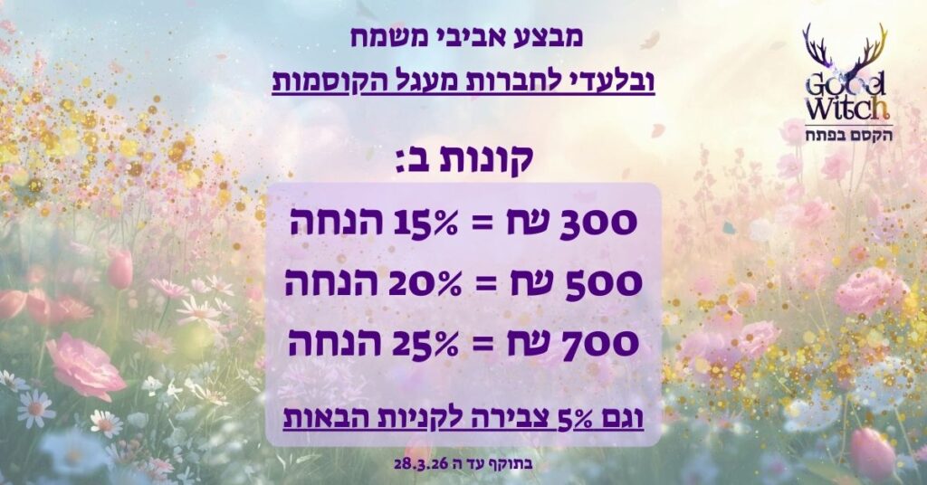 חברות המעגל של גוד וויטץ' נהנות מצבירת מטבעות בכל קנייה, מבצעים מיוחדים, תוכן בלעדי ועוד מלא קסמים מגניבים. ההרשמה למעגל הקוסמות הינה בחינם(!) בראש הדף או בקופה